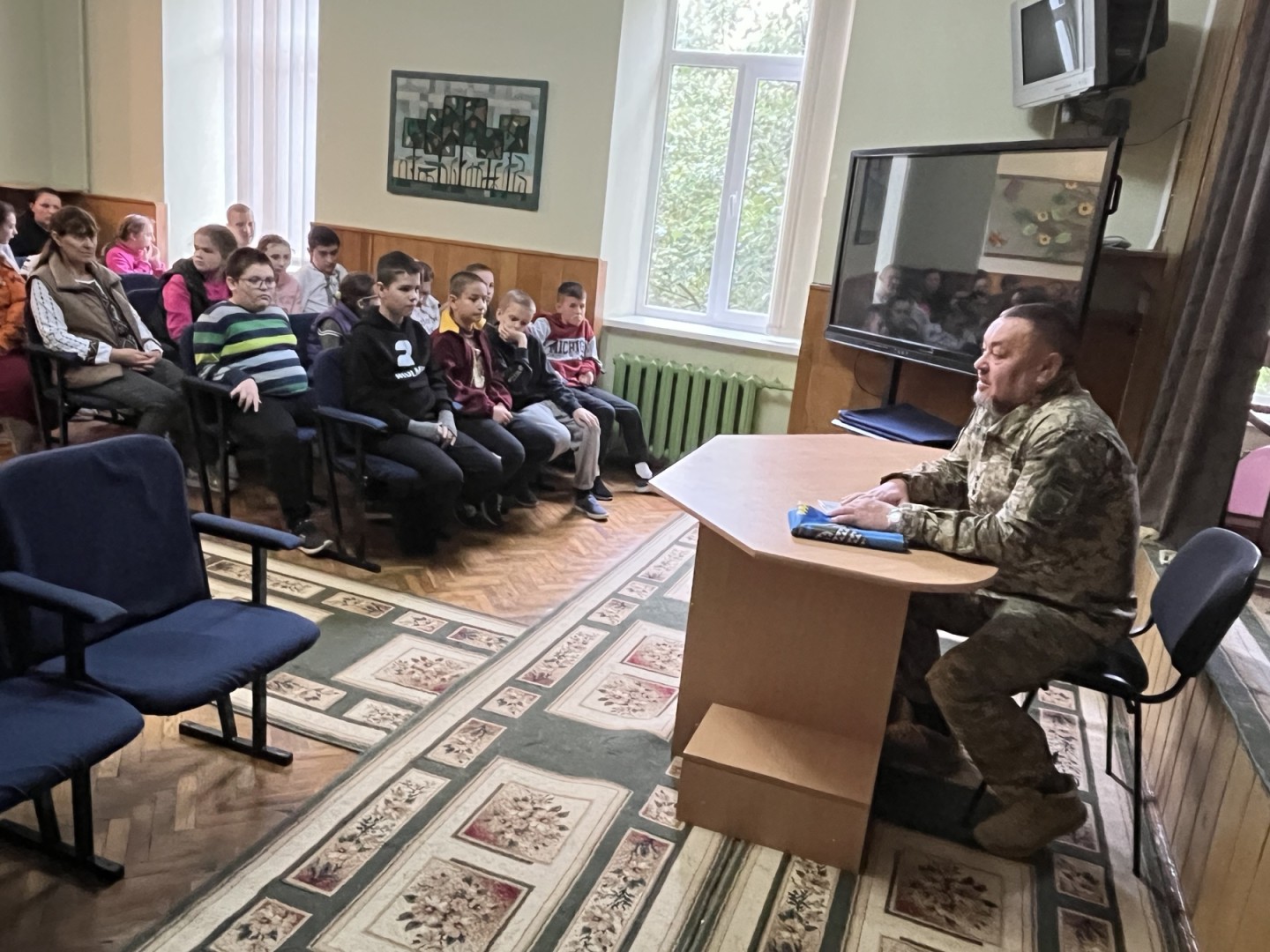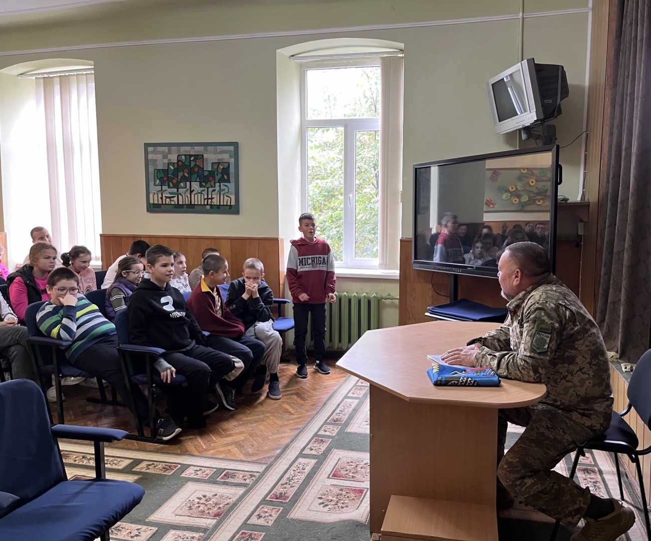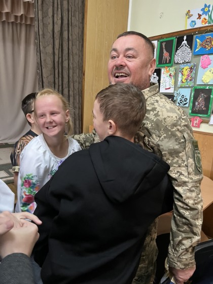 Діти активно долучалися до розмови, ставили запитання воїну, цікавилися його досвідом та історіями з армійського життя. На завершення зустрічі наш гість подарував школі прапор бригади, символ єдності, мужності та патріотизму, який тепер займатиме почесне місце в нашій школі.